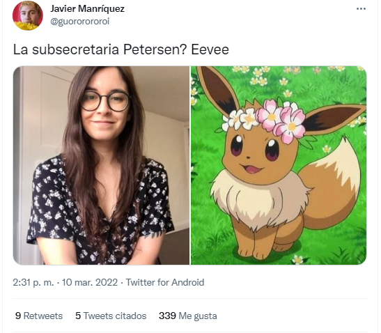 Finalmente, indicó que la futura subsecretaria de Economía, Javiera Petersen, sería una Eevee (Pokémon de tipo normal que se caracteriza por tener la mayor cantidad de evoluciones posibles).