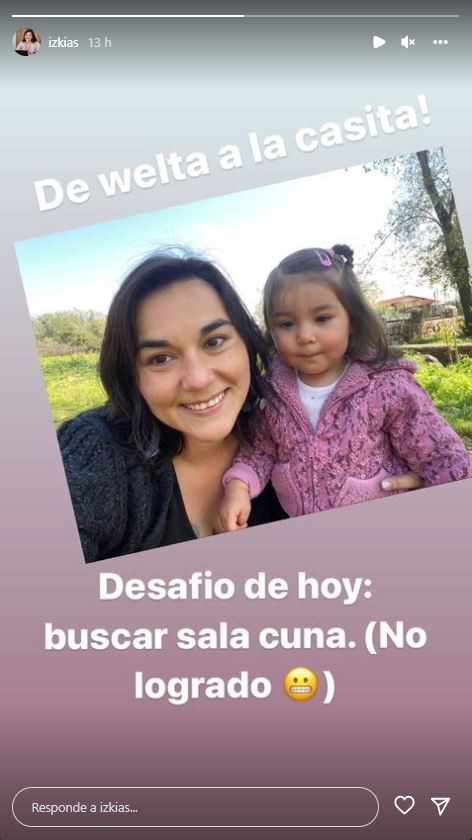 En una storie de Instagram, Siches publicó una foto junto a su hija Khala con el siguiente mensaje "de welta a la casita. Desafío de hoy: buscar sala cuna (no logrado)".