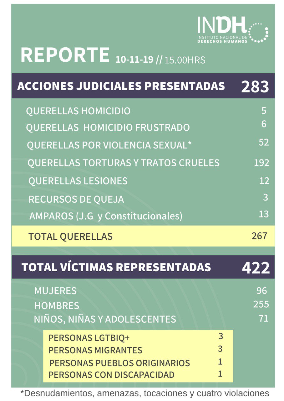 Esta vez, el Instituto Nacional de Derechos Humanos notificó que han representado a un total de 422 víctimas, entre las que se encuentran 255 hombres, 96 mujeres, 71 menores de edad, 3 personas pertenecientes a la comunidad LGTBQ+, 3 migrantes, una persona con discapacidad y una persona perteneciente a un pueblo originario.