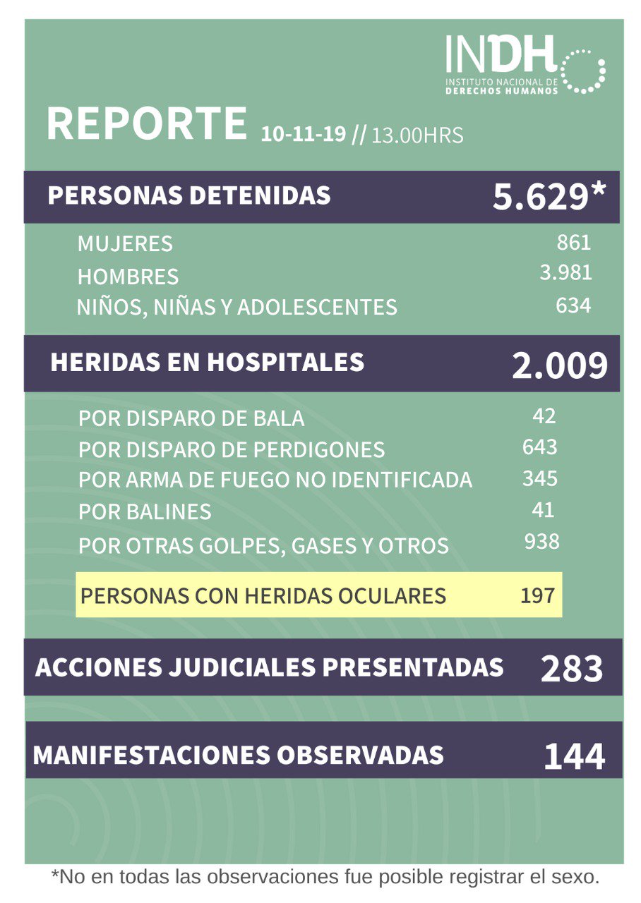 Lee también: INDH presenta querella contra Carabineros y exige poner fin al “uso indiscriminado” de escopetas antimotinesEn el caso de la cifra de personas lesionadas, se registran 2.009 casos en total. De ellos, la institución registra 197 casos con lesiones oculares en lo que va de estas tres semanas de manifestaciones.