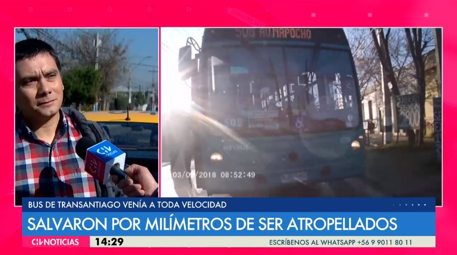 El registro corresponde a la cámara de seguridad del taxi. Su conductor comentó a Chilevisión Noticias que “la micro la vi al principio que venía lejos, y después la vi muy encima y frenó y no pude hacer nada”.