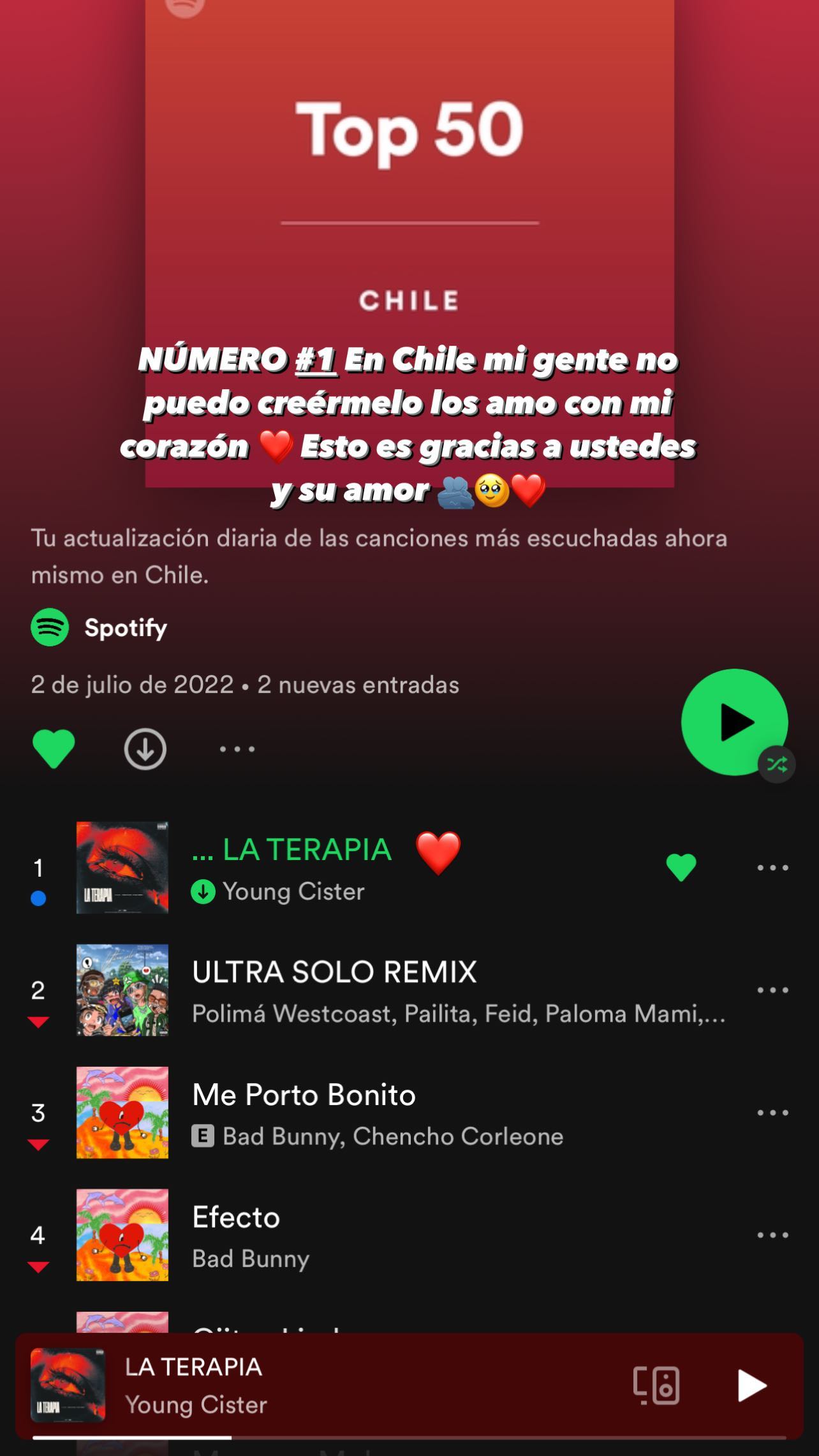 A sólo un día de su estreno, la canción se posiciona en el número 1 del Top 50 Chile en Spotify. "Mi gente no puedo creérmelo, los amo con todo mi corazón. Eso es gracias a ustedes y su amor", expresó el artista en sus redes sociales.