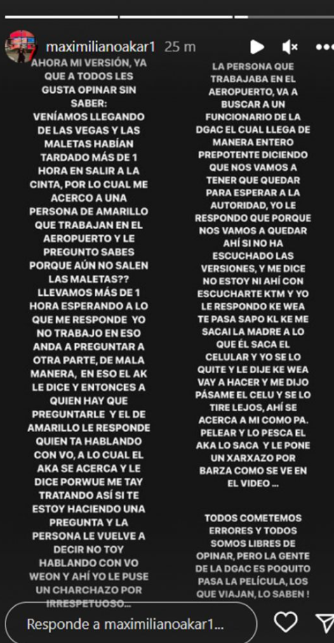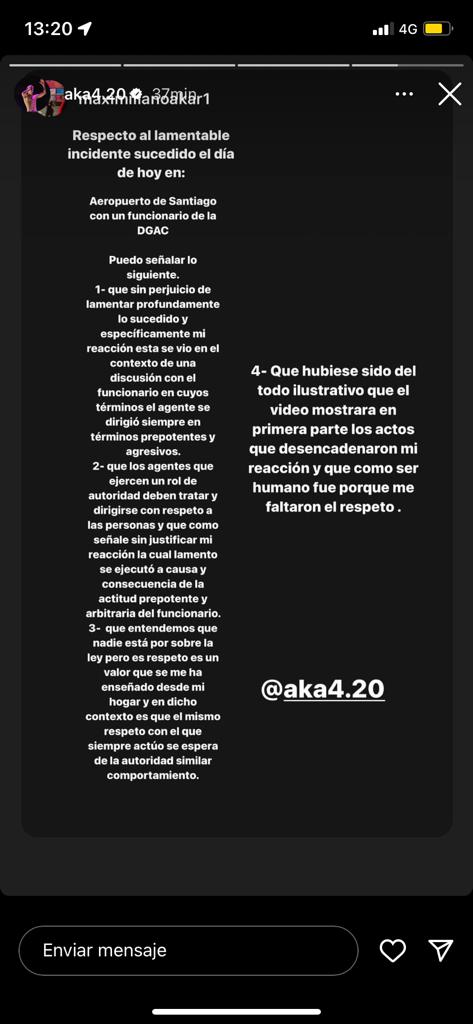 Horas después de lo sucedido, el joven oriundo de Talca publicó en su cuenta de Instagram una declaración para lamentar lo sucedido. "Mi reacción se dio en un contexto de una discusión con el funcionario, en cuyos términos el agente se dirigió a mi de manera prepotente y agresiva".
