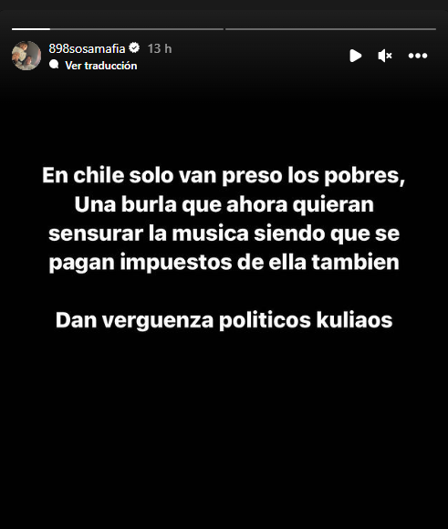 A través de su cuenta de Instagram, el intérprete de éxitos como Cochinae y Ganas publicó una historia donde señalando que "en Chile solo van preso los pobres".