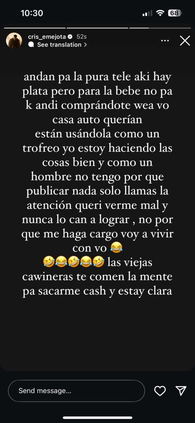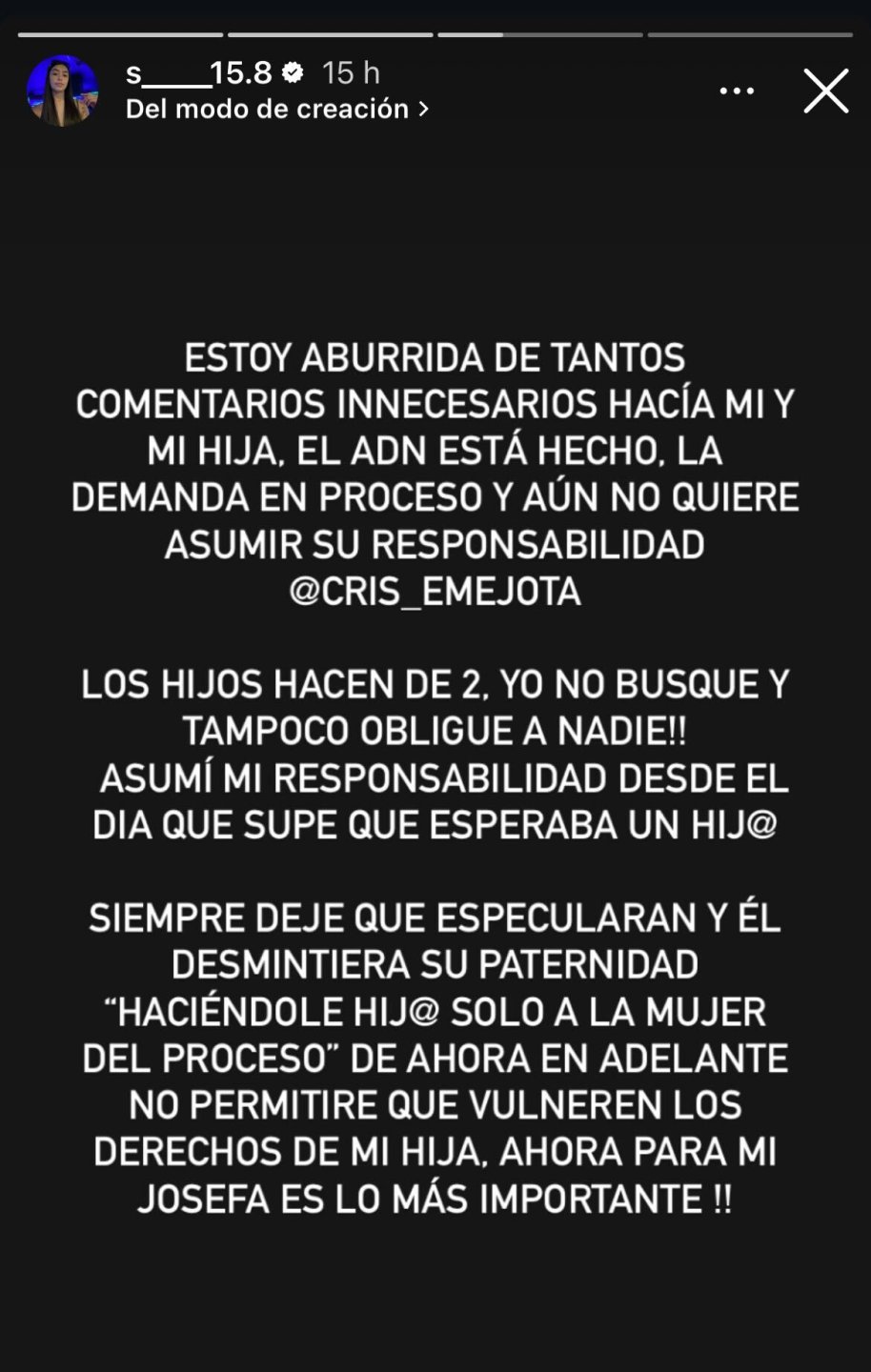 Salomé escribió a través de una historia de Instagram: "El ADN está hecho, la demanda en proceso y aún no quiere asumir su responsabilidad @cris_emejota".