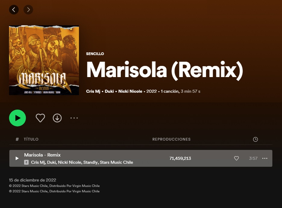 Marisola de Cris MJ y Standly ha traído importantes réditos para ambos artistas. Tras convertirse en un éxito instantáneo en nuestro país, la canción logró cruzar la cordillera e incorporó a los argentinos Duki y Nicki Nicole.