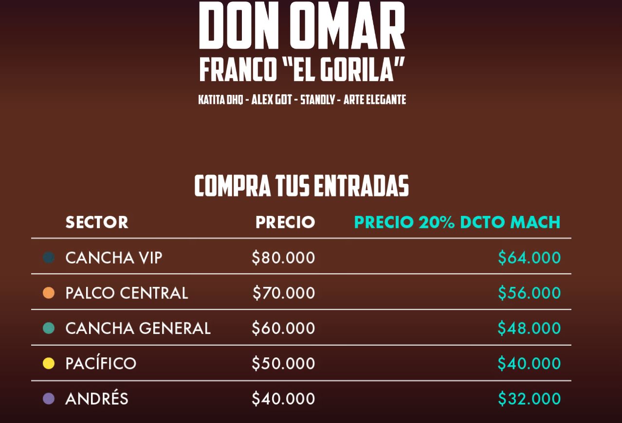 Los precios de las entradas varían desde los $40 mil para el sector Andrés, mientras que la Cancha Vip tiene un valor de $80 mil.
