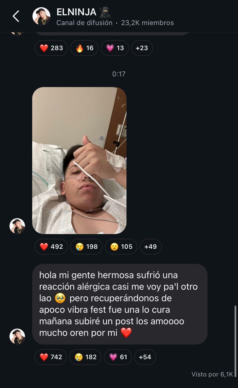 El cantante urbano compartió una foto de él en un centro asistencial, generando preocupación en sus seguidores a pocas horas de haberse presentado en el Vibra Fest. Según relató, "casi me voy pa’l otro lao", pero ahora se encuentra en recuperación.
