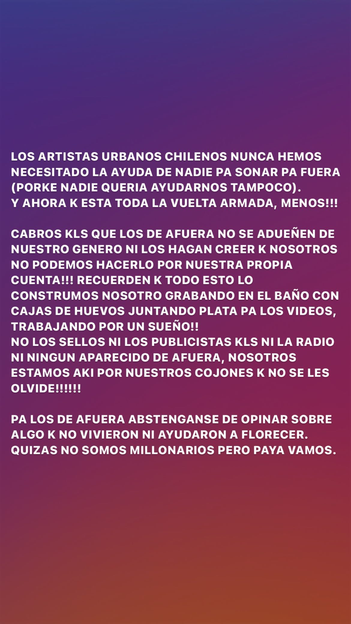 "Los artistas urbanos chilenos nunca hemos necesitado la ayuda de nadie para sonar afuera (porque nadie quería ayudarnos tampoco). Y ahora que está toda la vuelta armada, menos", partió diciendo el cantante de 22 años a través de sus historias de Instagram.