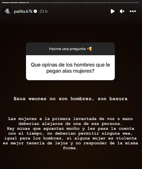 Pailita respondió que "esos weones no son hombres, son basura. Las mujeres a la primera levantada de voz o de mano deberían alejarse de una de esa persona. Hay minas que aguantan mucho y les pasa la cuenta con el tiempo. No deberían permitir ninguna weá. Igual para los hombres, si alguna mujer es violenta, es mejor tenerla de lejos y no responder de la misma forma".