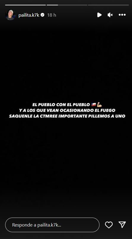 Pailita compartió un polémico mensaje en referencia a los incendios forestales registrados el fin de semana en la Región de Valparaíso, haciendo un llamado a golpear a quienes sean vistos provocando un siniestro. "El pueblo con el pueblo", comenzó diciendo en su post en Instagram.