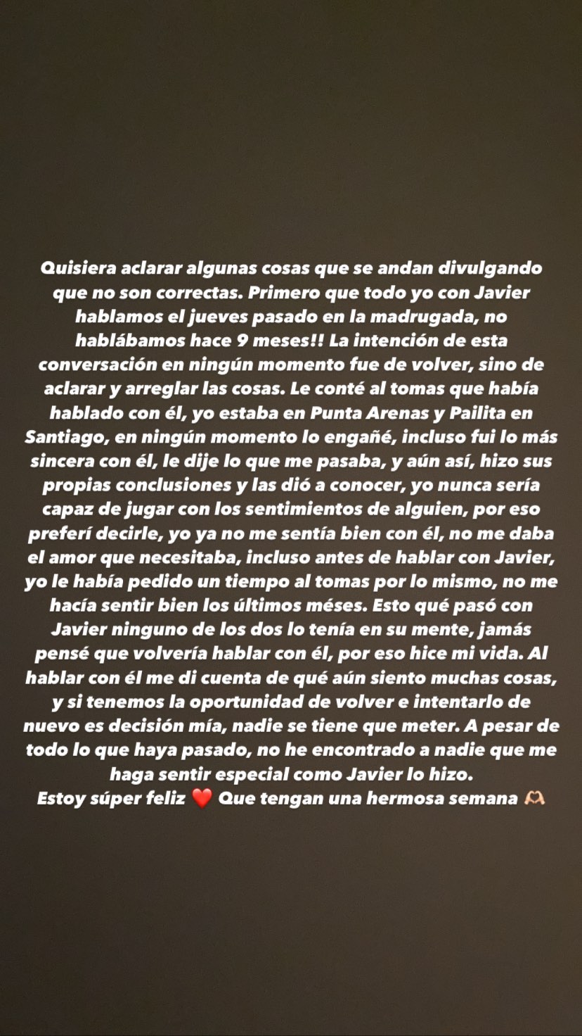 "A pesar de todo lo que haya pasado, no he encontrado a nadieque me haga sentirespecial como Javier lo hizo", reveló Skarleth en una storie, confirmando, de esta forma, que volvió con el magallánico.