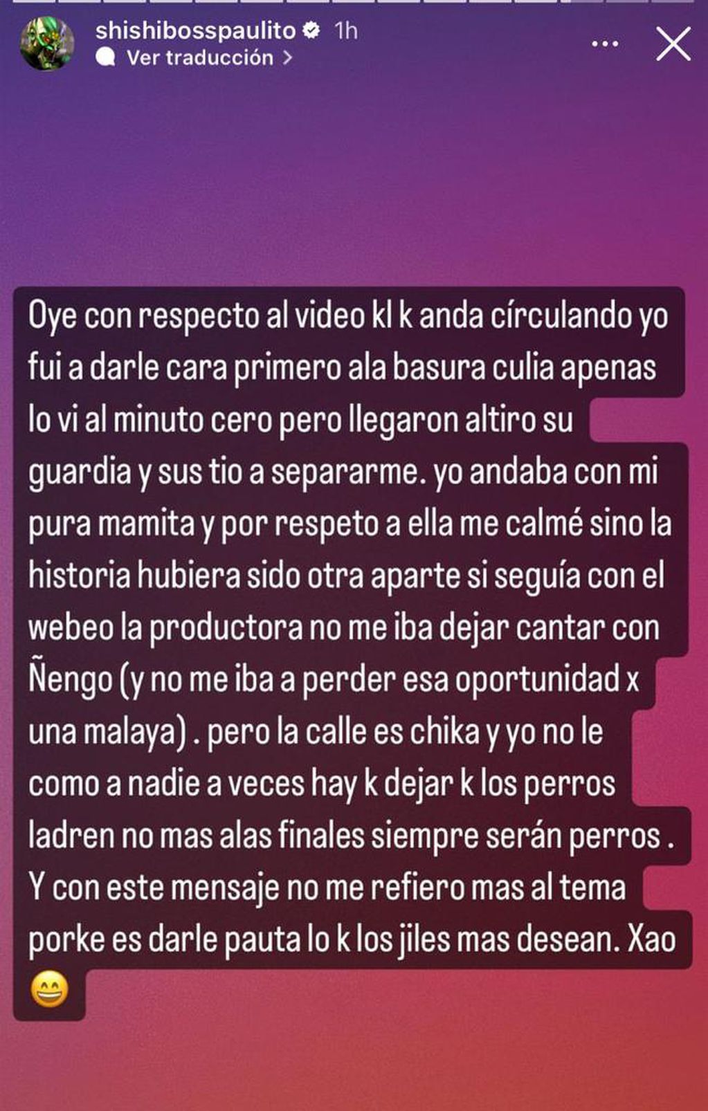 A pesar de que el episodio no pasó a mayores, ambos artistas decidieron continuar con el conflicto a través de sus redes sociales. En primer lugar, el líder de los Shishigang escribió en sus historias que "con respecto al video cu... que anda circulando, yo fui a darle cara primero a la basura cu...".