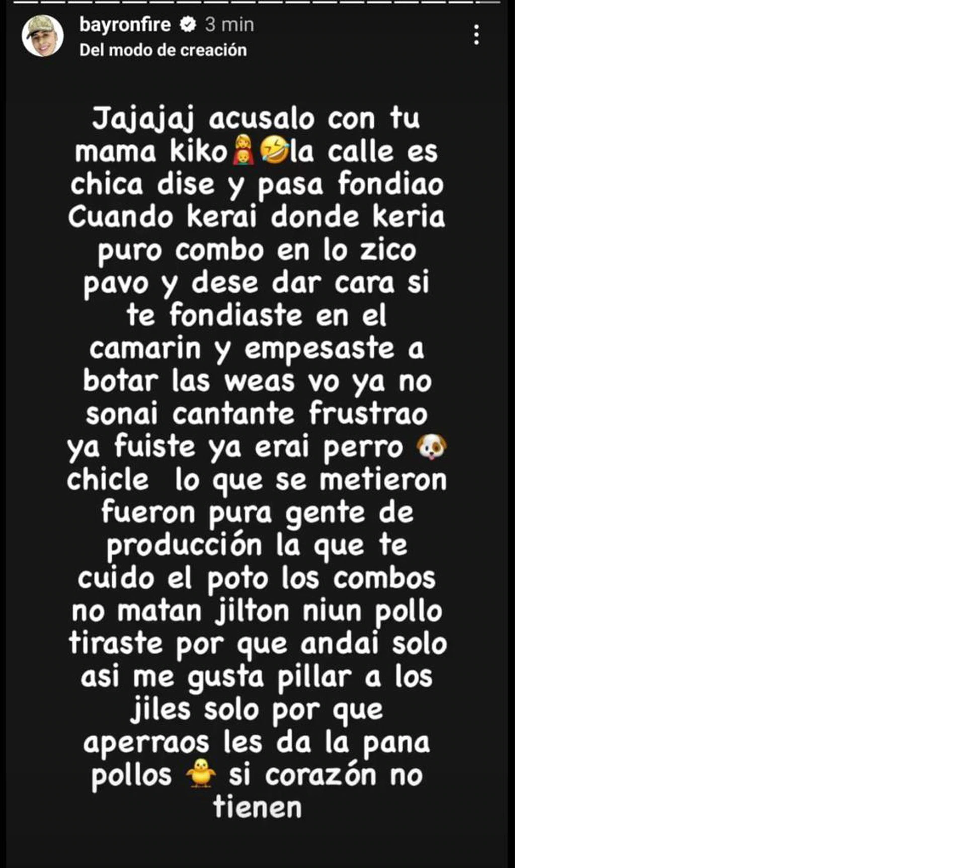 Unos minutos después, fue Bayron Fyre quien utilizó la misma plataforma para contestar. "Acúsalo con tu mamá, Quico. La calle es chica, dice, y pasa fondeado. Cuando quiera y donde quieras, puros combos en el hocico", comenzó diciendo.