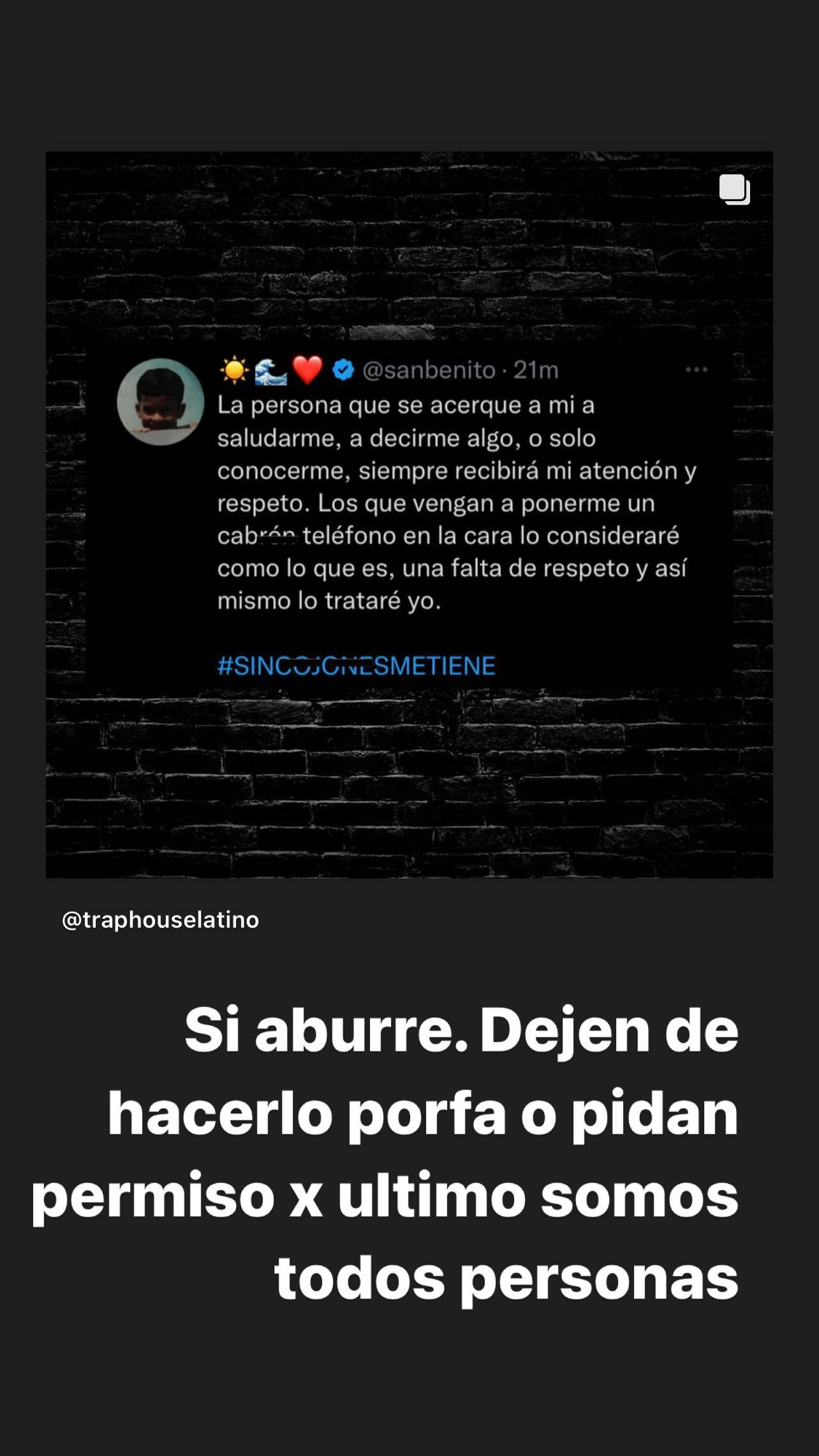 Por medio de esta red social, el artista nacional compartió el mencionado tuit del autor de Yonaguni junto al texto "sí, aburre. Dejen de hacerlo porfa o pidan permiso por último. Somos todos personas".