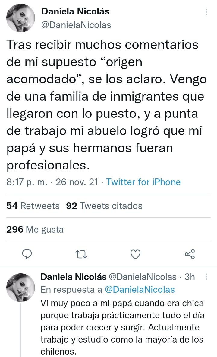 A través de su cuenta de Twitter, la ex Miss Chile respondió a quienes cuestionan su supuesto "origen acomodado", aclarando que viene "de una familia de inmigrantes que llegaron lo puesto". Además, indicó que "a punta de trabajo mi abuelo logró que mi papá y sus hermanos fueran profesionales".
