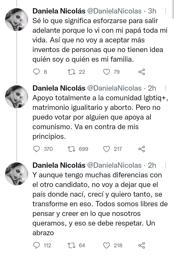 Lee también: Pancho Saavedra y candidato presidencial: "Mi apoyo siempre estará con quien esté de lado de nuestra comunidad"Sin nombrar ningún candidato explícitamente, Nicolás reveló su intención de voto para los comicios del próximo 19 de diciembre. “Apoyo totalmente a la comunidad LGBTIQ+, matrimonio igualitario y aborto. Pero no puedo votar por alguien que apoya el comunismo. Va en contra de mis principios”, señaló.
