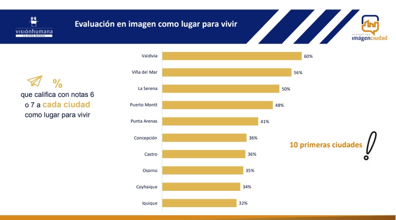 En esta ocasión, el 60% de los encuestados evaluó con notas entre 6 y 7 a la capital de la región de Los Ríos, Valdivia, relegando a Viña del Mar al segundo lugar por primera vez en tres años (56%), seguida por La Serena (50%), Puerto Montt (48%) y Punta Arenas (41%).