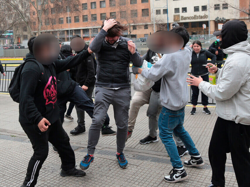 En el registro se ve a un grupo de jóvenes golpear con puños y pies al periodista a las afueras de la Casa Central de la Universidad de Chile.