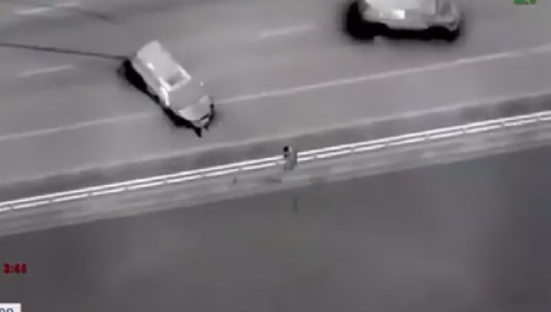 El video de la cámara del helicóptero muestra al vehículo conducido por Gray circulando a gran velocidad por el puente Edison e incluso chocando contra la barrera de seguridad hasta que se detiene y se ve salir a una persona que se dirige a la barrera, la cruza y salta al río mientras varios autos policiales aparecen en escena.