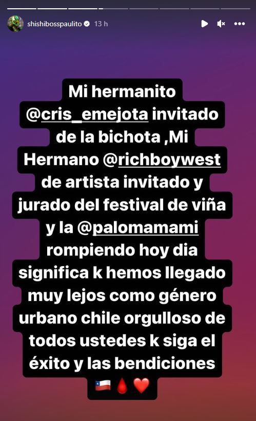 Mi hermano Polimá Westcoast de artista invitado y jurado del festival y la Paloma Mami, rompiendo hoy día. Significa que hemos llegado muy lejos como género urbano en Chile. Orgulloso de todos ustedes, que siga el éxito y las bendiciones", expresó en su cuenta de Instagram.