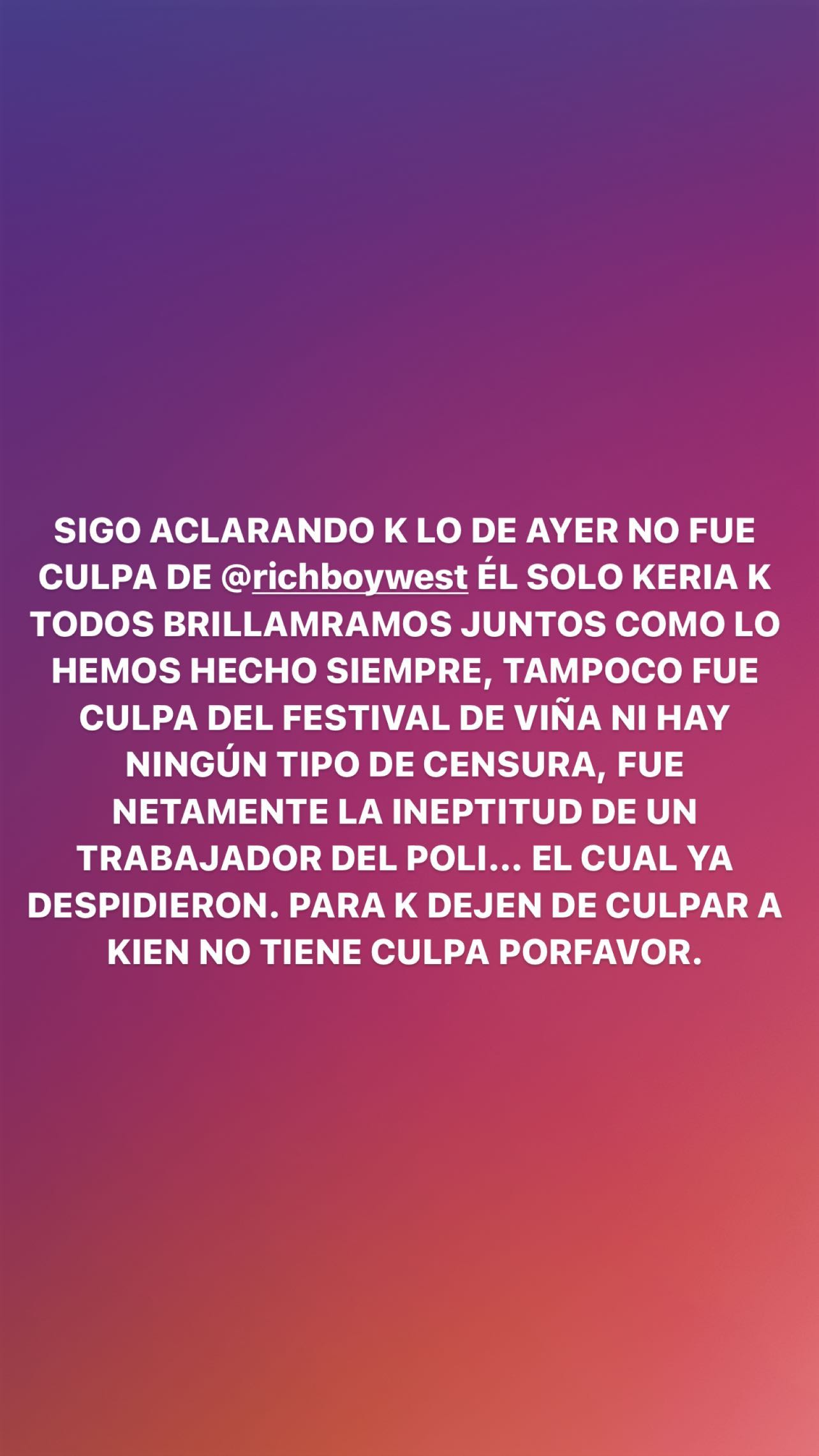 "Malayas ctm, me silenciaron de pana", expresó en Instagram, donde acusó que intentaron opacarlo. Así mismo aclaró que no tiene nada contra su amigo y colega Polimá, ni contra la producción del certamen viñamarino, sino más bien contra el equipo del artista. "Sigo aclarando que lo de ayer no fue culpa de Polimá. Él solo quería que todos brilláramos juntos como lo hemos hecho siempre. Tampoco fue culpa del Festival de Viña ni tampoco hay ningún tipo de censura", escribió en sus stories. "Fue netamente la ineptitud de un trabajador del Poli, el cual ya despidieron. Para que dejen de culpar a quien no tiene la culpa, por favor", cerró.