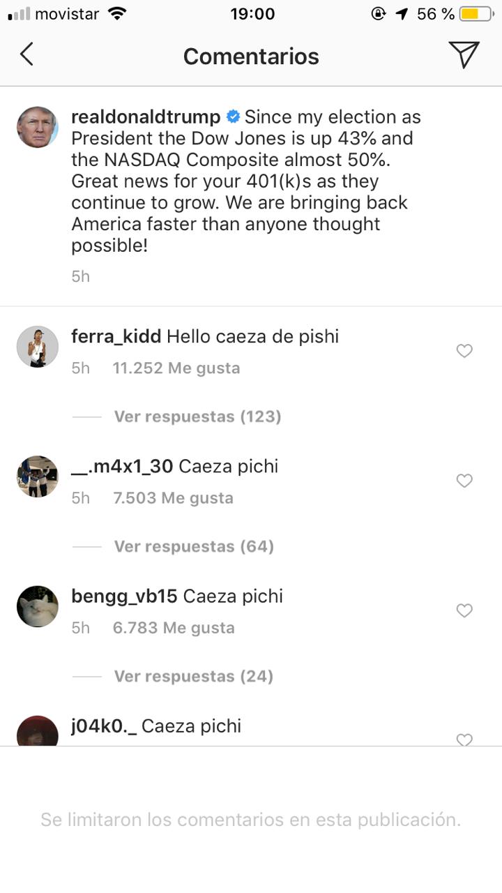 Lee también: ¿Cuántos seguidores obtuvo Felipe Avello en Instagram tras su rutina en Viña?Fueron tanto los comentarios, que en la cuenta de Instagram se limitaron la cantidad de comentarios en las publicaciones de Trump, no permitiendo nuevas respuestas.