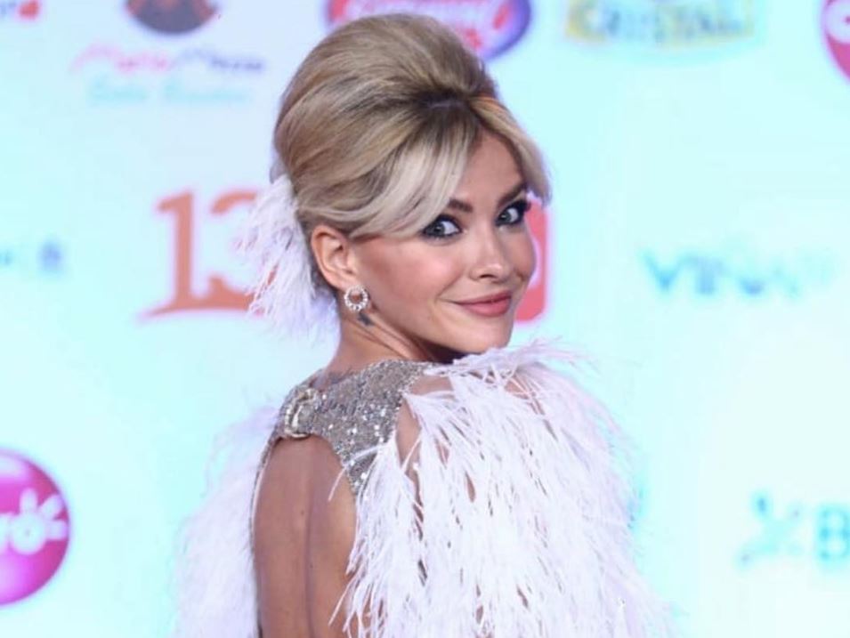 La actriz llegó sin Benjamín Vicuña al evento y lució un atuendo de color dorado metalizado con plumas en los hombros.