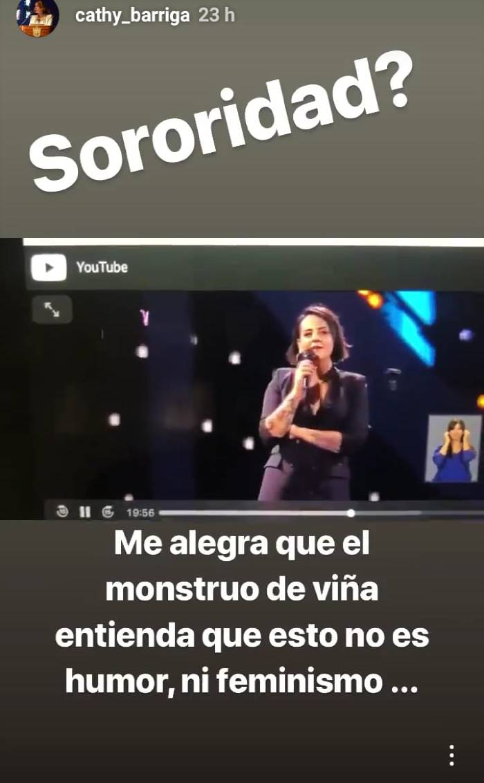"Sororidad? “Me alegra que el monstruo de Viña entienda que esto no humor, ni feminismo", comentó la jefa comunal, junto a una captura de pantalla del video del show de Dueñas tomado desde YouTube.Cabe recordar que en un momento de la rutina, Jani se refirió a Barriga (aunque sin decir su nombre), al momento de señalar que: "¿Qué es lo que pasa cuando no hay sororidad? Terminas haciendo el Kiki Challenge en un auto municipal, o haces un mural en tu comuna con tu cara".