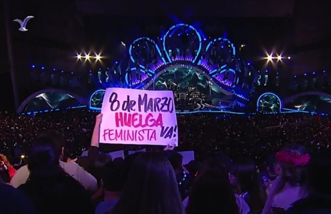 Desde el festival de viña del mar con fuerza decimos a Chile y toda América Latina: el 8 de marzo, día internacional de la mujer trabajadora #LaHuelgaFeministaVa Juntas exigimos una sociedad justa para todxs#VinaPorTVN pic.twitter.com/wiRcz1pTpX— Coordinadora Feminista 8M (@Coordinadora8m) February 27, 2019