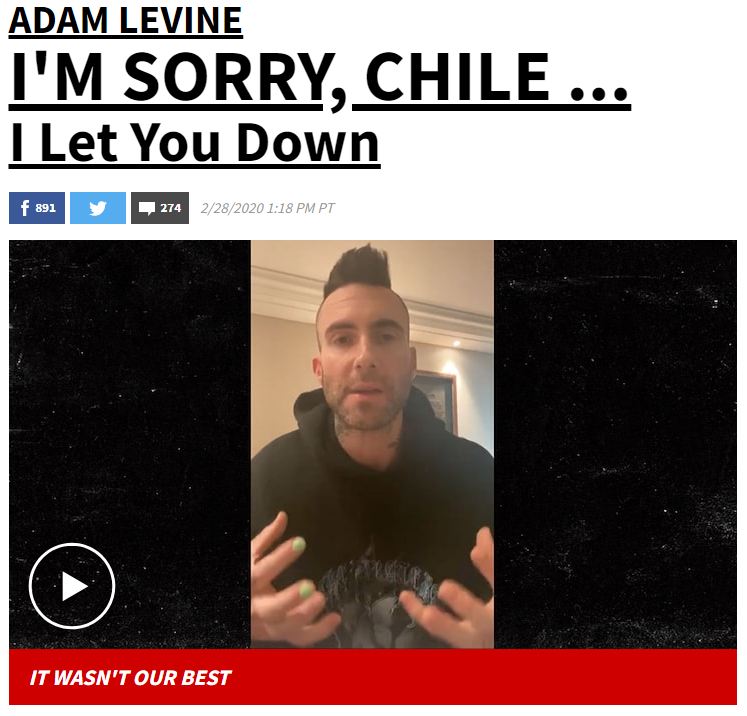 “Adam Levine: Lo siento, Chile. Los decepcioné”, titularon el artículo en TMZ, donde también destacan las palabras del vocalista de la banda que se presentó por 66 minutos, tocó 15 canciones en el festival y no esperó a recibir ninguna Gaviota.