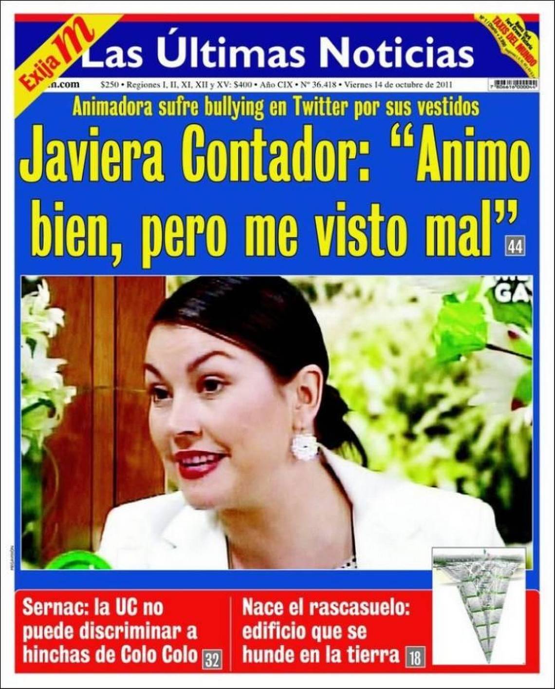 A la vez, la comediante aprovechó su rutina para lanzar algunos dardos al diario Las Últimas Noticias por una portada que llegó a los kioscos el 14 de octubre de 2011 con el titular "Javiera Contador: 'Animo bien, pero me visto mal".