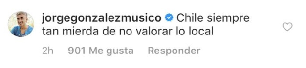 Se trata de Jorge González, quien, a través de su cuenta de Instagram, comentó “Chile siempre tan mierda de no valorar lo local”.