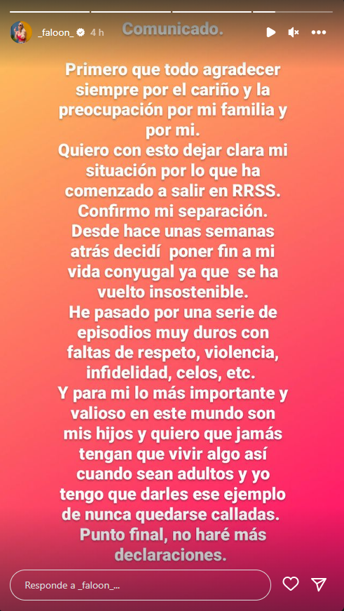 "Confirmo mi separación. Desde hace unas semanas decidí poner fin a mi vida conyugal, ya que se ha vuelto insostenible. He pasado por una serie de episodios muy duros