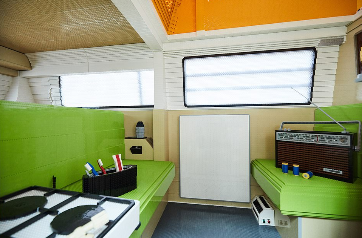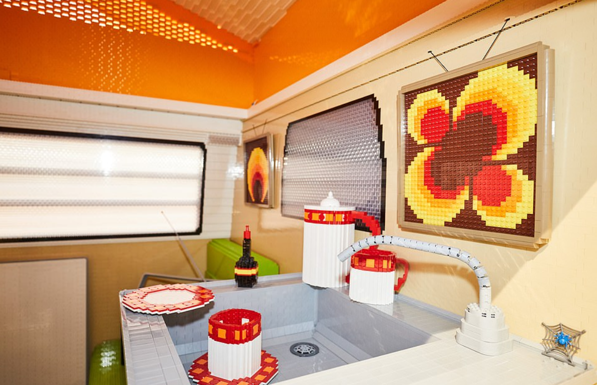 Los detalles de la construcción son increíbles. Las luces se prenden, las ventanas son de ladrillos de Lego transparentes, hay cuadros en las paredes y hasta cepillos de dientes hechos de las memorables piezas.