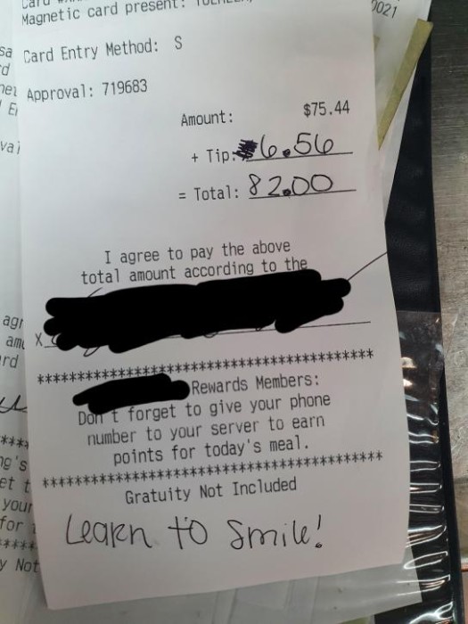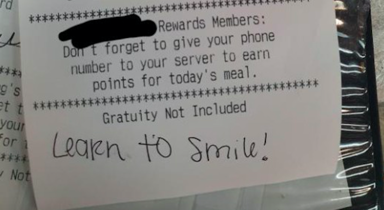 "Aprende a sonreír", le escribieron al joven en una boleta luego de atender a unos clientes, recibiendo además una baja propina por su supuesta mala actitud, de acuerdo a lo informado por medios como 7 News.
