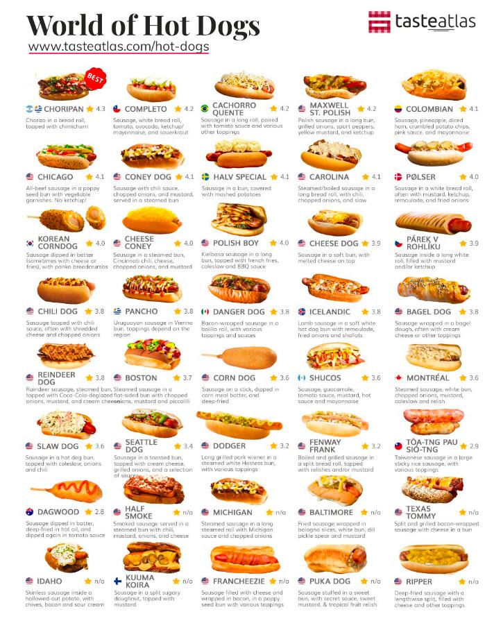 en la tabla habían 40 tipos de "hot dogs", con diferentes orígenes e ingredientes. Sin embargo, Chile se ubicó en el tercer lugar, detrás del