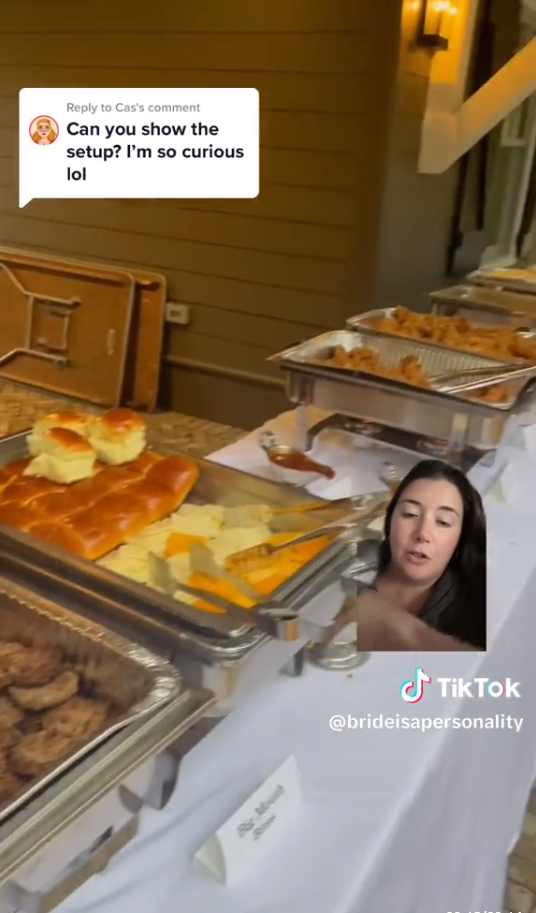 Tras eso, contó que debían mantener la comida fría y explicarles a los garzones cómo servir todo."La comida estuvo increíble y otras personas también lo dijeron. Podrían haber estado mintiéndonos, pero teníamos tiras de pollo, rollos de huevo, papas fritas y salsa, pasta, ensalada. Quiero decir, fue la comida perfecta para nuestra boda", recordó.
