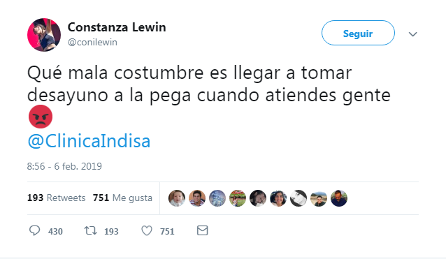 "Qué mala costumbre es llegar a tomar desayuno a la pega cuando atiendes gente", escribió la cantante aludiendo a una clínica del sector oriente.