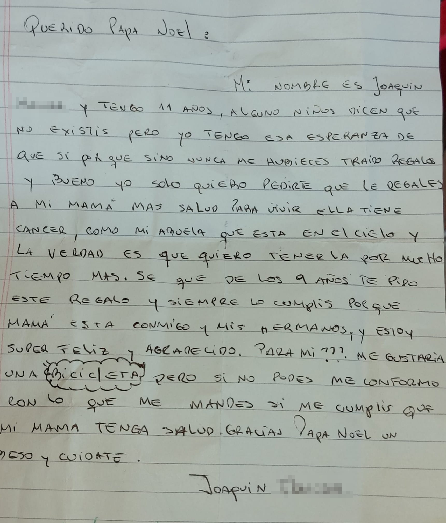 "Querido Papá Noel: mi nombre es Joaquín y tengo 11 años; algunos niños dicen que no existís pero yo tengo la esperanza de que sí, porque si no, nunca me hubieses traído regalos y bueno yo sólo quiero pedirte que le regales a mi mamá más salud para vivir", escribió el pequeño en su carta.