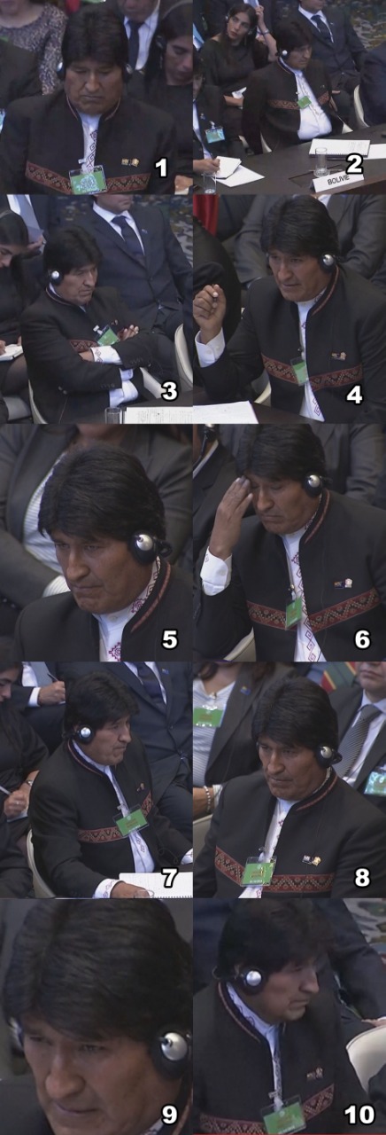 Pese al optimismo inicial del mandatario, su rostro fue cambiando en la medida que el juez somalí Abdulqawi Ahmed Yusuf iba desestimando los argumentos de Bolivia.