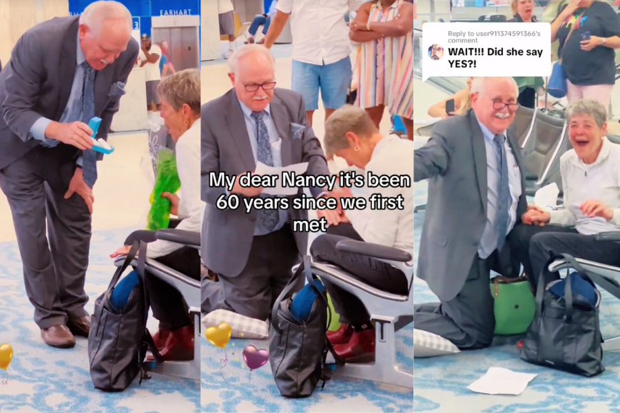 La romántica propuesta se realizó en un aeropuerto, donde Thomas leyó una carta de amor dedicada a Nancy, a quién conoció hace 60 años. "Quiero pasar el resto de mi vida contigo", expresó el adulto mayor.