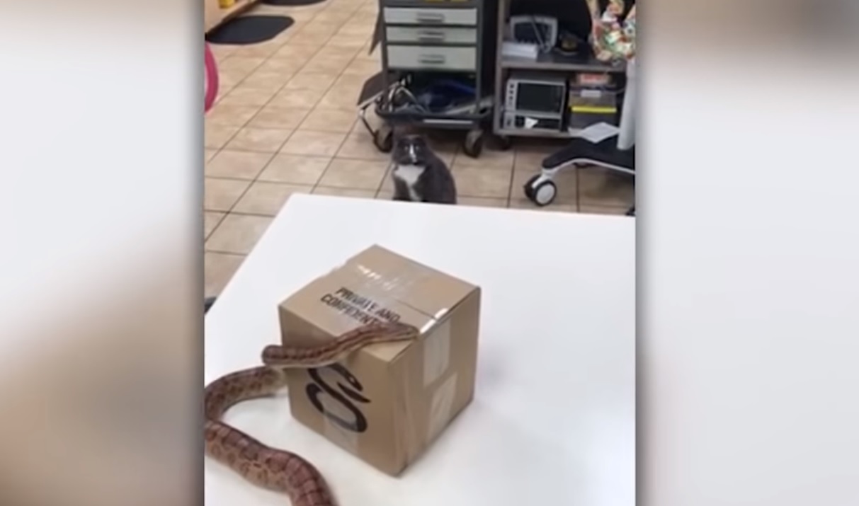 Lee también: El extraño caso de una foca con una anguila atrapada en su narizEn una veterinaria ubicada en la provincia de Nueva Escocia, Canadá, un gato tuvo su primer encuentro con una serpiente.