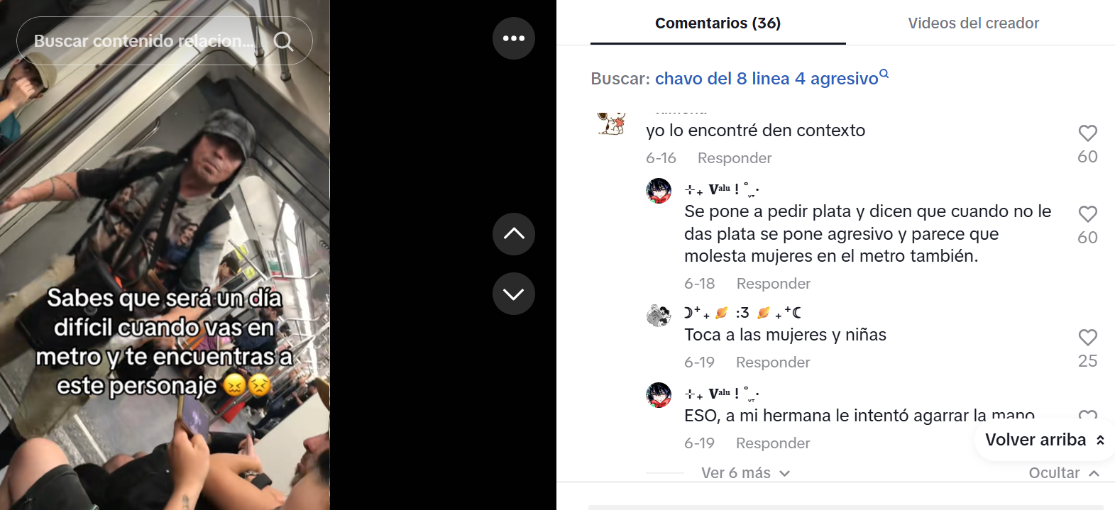 A través de la red social TikTok muchos comentarios apuntan a la actitud del Chavo del 8 del metro, donde lo acusan de ser agresivo al no recibir dinero de los pasajeros y hasta de tener actitudes de acoso a mujeres.