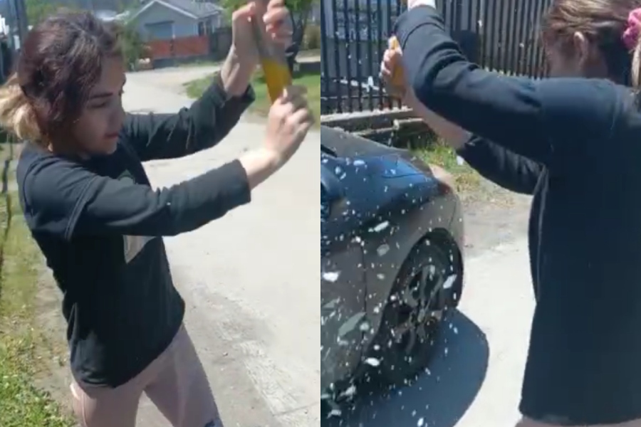 En el registro se evidencia que, a pesar de la constante insistencia para que la mujer frenara su ataque, esta continuó y rompió la lata del vehículo, las ventanas, y los vidrios delantero y trasero.