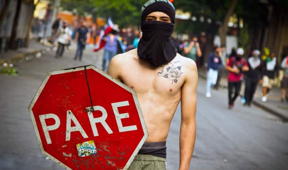 Pero el can no es el único. Durante los últimos días se ha viralizado la imagen de un joven que, sin polera, combate la violencia policial protegiéndose con un Disco Pare.