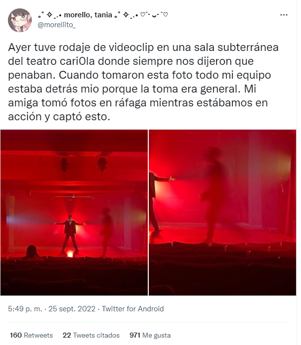 Recientemente, se viralizó a través de Twitter un "hecho inexplicable" ocurrido en plena grabación de un video musical. "Tuve rodaje de videoclip en una sala subterránea del Teatro Cariola, donde siempre nos dijeron que penaban", partió diciendo la usuaria @morellito_.