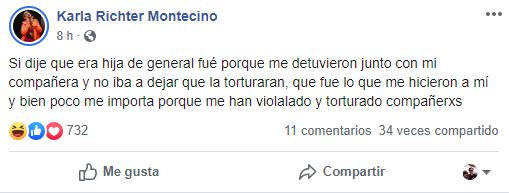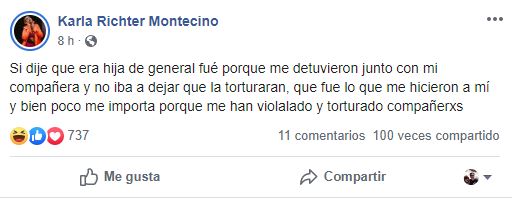 "Soy hija de un general dije para proteger a mi compañera malditos bastardos y qué pasaaashhh (sic) muestren el video completo (...) Si dije que era hija de general fue porque me detuvieron junto con mi compañera y no iba a dejar que la torturaran", escribió.