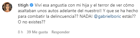 En un comentario en redes sociales, la locutora radial indicó que se encontraba junto a su hija y criticó duramente al gobierno. "¿Y qué se ha hecho para combatir la delincuencia?", expresó.
