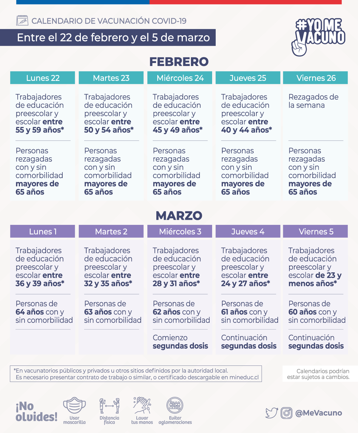 - Miércoles 24 de febrero: Trabajadores de la educación preescolar y escolar de entre 45 y 49 años. Además de personas rezagadas con o sin comorbilidad mayores de 65 años.